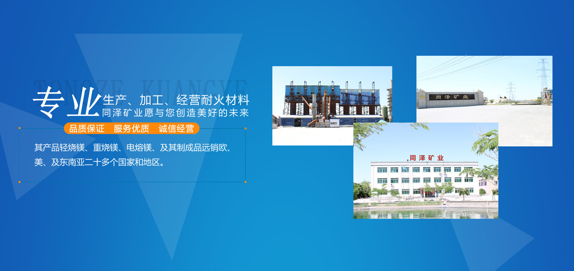 大石橋市同澤礦業(yè)有限公司,是以生產(chǎn)、加工、經(jīng)營各種耐火材料為主的綜合性經(jīng)濟實體。其產(chǎn)品輕燒鎂、重?zé)V、電熔鎂、及其制成品遠(yuǎn)銷歐、美、及東南亞二十多個國家和地區(qū)。